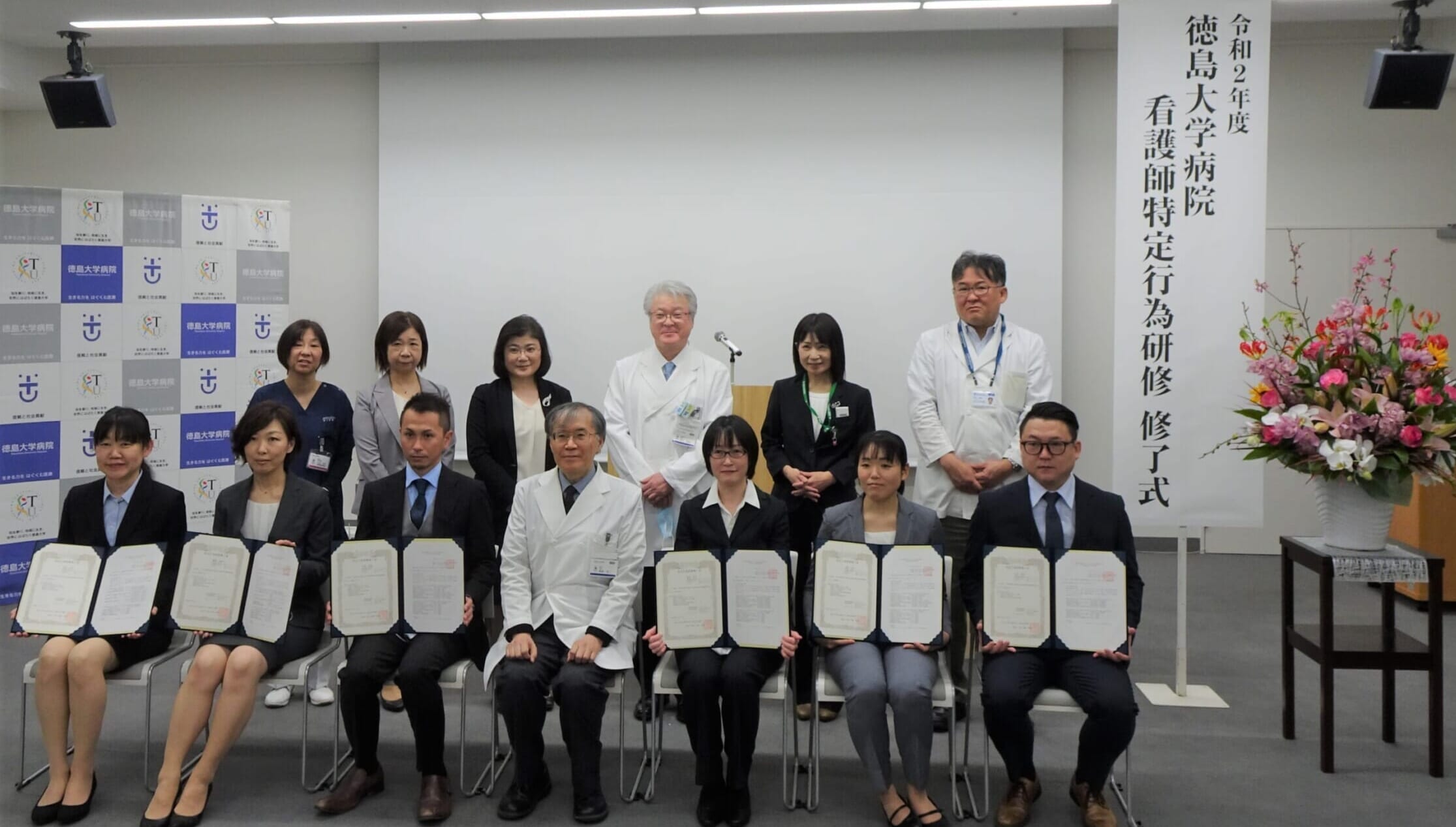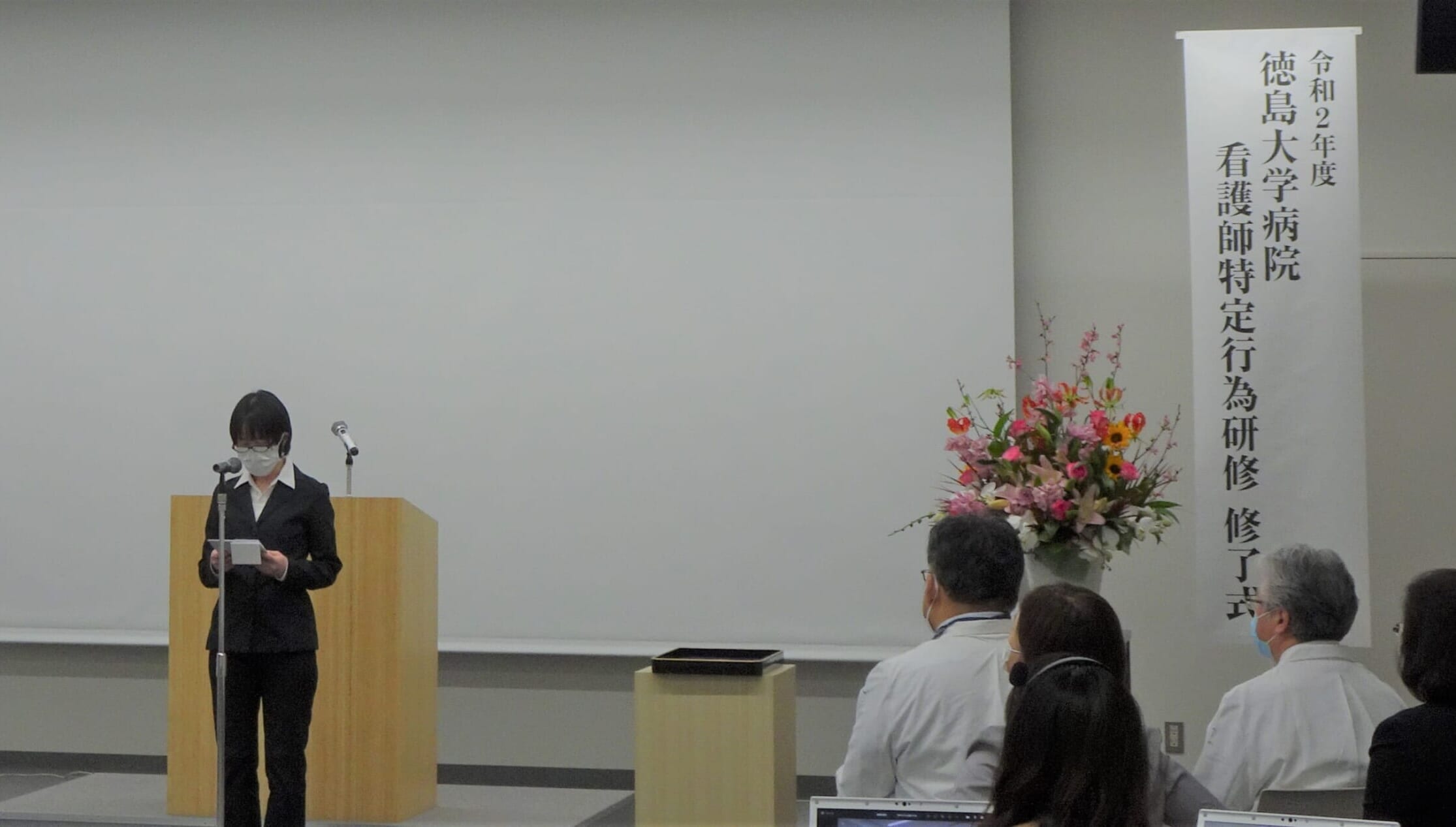 令和2年度徳島大学病院看護師特定行為研修受講生(6名)による「臨地実習報告会」ならびに「修了式」を対面とWEBのハイブリッド方式で行いました。臨地実習報告会では、各受講生が自施設で指導医のもと、看護と医学の両方の視点からアセスメントし、手順書をもとに実践した特定行為実践内容を報告しました。また、修了式では、徳島県看護協会会長の稲井芳枝様、徳島県保健福祉部副部長の鎌村好孝様より、受講生の今後の活躍への期待をこめたお言葉をいただきました。今年度は、6区分『呼吸器(気道確保に係るもの)関連』6名、呼吸器(人工呼吸療法に係るもの関連)』4名、『動脈血液ガス分析関連』6名、『栄養及び水分管理に係る薬剤投与関連』5名、『術後疼痛管理関連』3名、『循環動態に係る薬剤投与関連』5名が修了でき、病院長より修了証が授与されました。